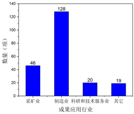 表1为登记的科技成果来源构成,可知2019年自主研发的成果数量最多,共84项,占比登记总数的39.43%;国家重点研发计划、重点基础研究发展计划(973)、高技术研究发展计划(863)等国家科技计划34项,占比登记总数的15.96%;部委和地方计划分别为27项和20项,分别占比12.67%和9.40%。综合来看,国家财政资助成果共100项,占比登记成果总数的46.95%;非国家财政资助项目共113项,占比登记成果总数的53.05%。