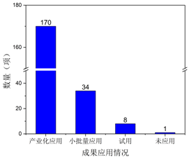 从成果应用行业来看(图5),主要应用于制造业,达128项,占比登记成果总数的60.09%;采矿业、科研和技术服务业分别为46项、20项,分别占比登记成果总数的21.60%、9.39%。2019年登记的科技成果中,成果处于初期阶段8项、中期阶段19项、成熟应用阶段186项,其中170项成果已产业化应用(图6),占比登记成果总量的79.81%,表明成熟阶段的项目大多投入产业化应用。