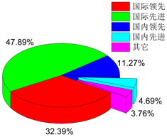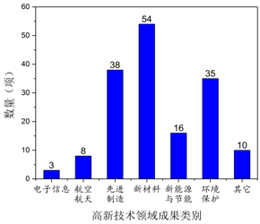 2019年登记的科技成果中,原始性创新174项,国外引进消化吸收创新16项,国内技术二次开发22项。从成果水平来看(图7),国际领先项目69项,占比登记总数的32.39%,国际先进项目102项,占比登记总数的47.89%,国际水平成果整体占比登记成果总数的八成以上。2019年登记的科技成果中,164个项目属于高新技术领域成果,其中新材料、先进制造、环境保护数量较多,分别为54项、38项、35项(图8)。