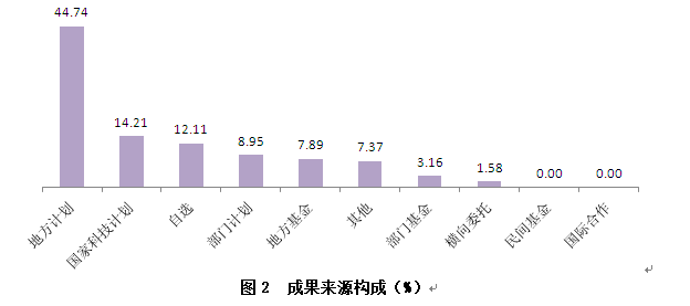 以各级财政支持的计划项目成果为主。其中,来源于各级科技计划项目的成果129项,占67.89%;部门基金和地方基金项目成果21项,占11.05%。在各级科技计划项目中,国家科技计划项目成果占登记总量的14.21%;部门科技计划项目成果占8.95%;地方科技计划项目成果占44.74%。在国家科技计划项目成果中,国家自然科学基金13项,占登记总量的6.84%;国家科技重大专项8项,占登记总量的4.21%;国家科技支撑计划1项,占登记总量的0.53%;国家其他科技计划5项,占登记总量的2.63%。见图2。
