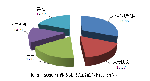 独立科研院所、企业和大专院校是项目成果的主要完成单位,按成果数量排序依次是:独立科研机构59项,占31.05%;其他项目37项,占19.47%;企业34项,占17.89%;大专院校33项,占17.37%;医疗机构27项,占14.21%。(见图3)。