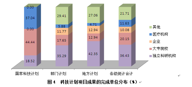 在129项各级科技计划项目成果中,独立科研机构、其他机构与大专院校是主要完成单位。其中,独立科研院所所占比例最高,为36.43%;其次是其他机构占21.71%;大专院校占20.15%。各级科技计划完成单位情况见图4。