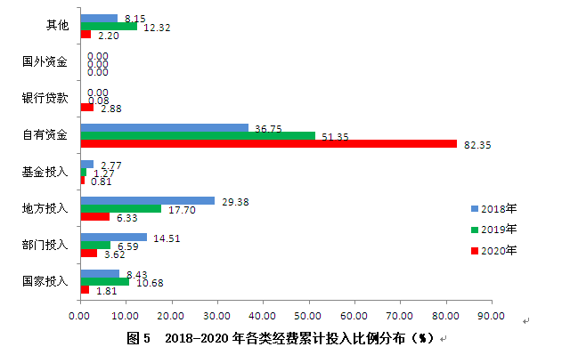 2020年累计投入106453万元,其中,国家投入1930万元,占1.81%;部门投入3851万元,占3.62%;地方投入6740万元,占6.33%;基金投入860万元,占0.81%;自有资金投入87662万元,占82.35%;银行贷款3064万元,占2.88%;其他资金投入2346万元,占2.20%(见图5)。