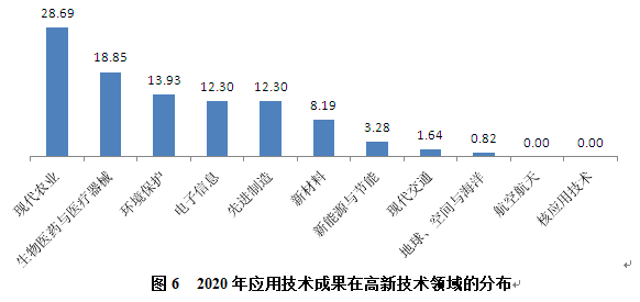 122项应用技术成果属于高新技术领域,主要分布在现代农业、生物医药与医疗器械领域,其次是环境保护、电子信息和先进制造等领域,新材料、新能源与节能、现代交通和地球、空间与海洋等领域项目成果也占一定比例(见图6)。