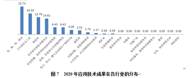 应用技术成果主要应用于农、林、牧、渔业,占25.73%;其次是卫生和社会工作行业,占19.30%;制造业与科学研究和技术服务业等应用成果也占较大比例,分别占15.79%和14.62%(见图7)。