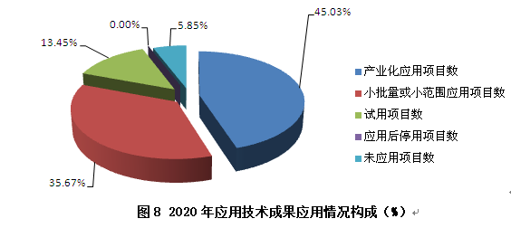 目前,已应用的技术成果有138项,占应用技术成果的80.70%;试用项目数23项,占应用技术成果的13.45%;未应用项目数10项,占应用技术成果的5.85%(见图8)。