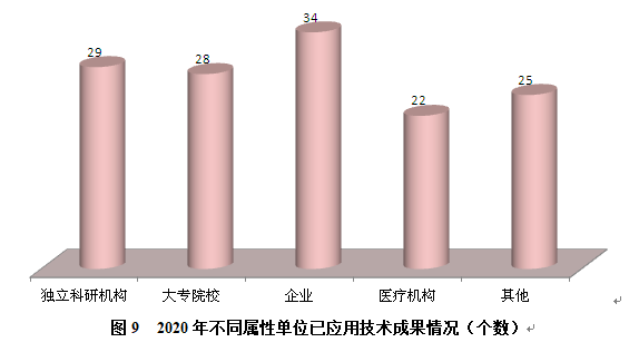 在已应用的项目成果中,企业应用技术成果应用数最多,占24.64%;独立科研机构和大专院校应用技术成果应用数次之,分别占21.01%和20.29%;其他成果和医疗机构应用技术成果分别占18.12%和15.94%。(见图9)。