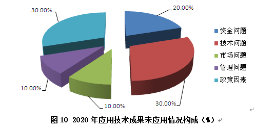 在171项应用技术成果中,有10项未应用。其中因技术问题或政策因素未应用的分别有3项,有2项因资金问题未应用,市场问题和管理问题各1项(见图10)。