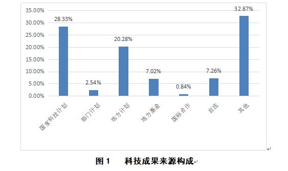 2020年度登记的科技成果仍以各级财政支持的各类计划项目成果为主,来源于各级科技计划项目的成果181项,占成果登记总数的51.15%;地方基金25项,占7.02%;国际合作3项,占0.84%;自选项目26项,占7.26%;其它项目118项,占32.87%。各级计划项目中,国家科技计划项目100项,占成果登记总数的28.33%;部门计划9项,占2.54%;地方计划72项,占20.28%;。见图1: