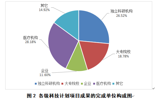 据统计,各级科技计划项目成果完成单位分布主要集中在医疗机构、独立科研机构、大专院校和企业,其中,医疗机构完成的成果所占比最高,为28.18%;其次是独立科研机构,为26.52%;再次是大专院校,为18.78%;企业为11.60%。见图2: