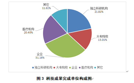 2020年度登记的353项科技成果中,由企业完成110项,占31.16%;独立科研机构完成77项,占成果总数的21.81%;医疗机构完成72项,占20.40%;大专院校完成53项,占15.01%;其它单位完成41项,占11.61%。见图3: