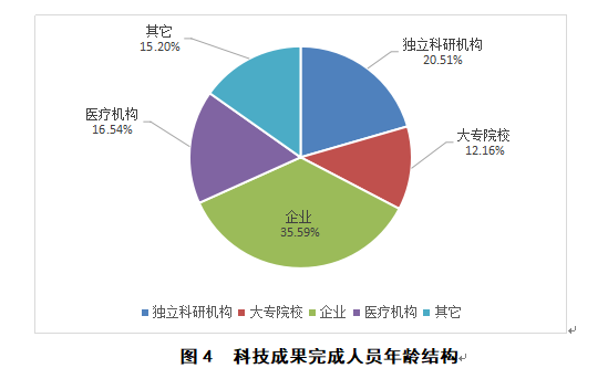 (1)2020年度登记的科技成果涉及到的完成人员共3973人次,比上年增长11.85%。从单位属性看,企业科技成果完成人员为1414人,占完成人员总数的35.59%;独立科研机构成果完成人员为815人次,占登记总数的20.51%;医疗机构成果完成人员为657人,占登记总数的16.54%;大专院校成果完成人员分别为483人,占登记总数的12.16%;其它人员为604人,占登记总数的15.20%。可见,企业和独立科研机构是科学技术研究的主体。见图4: