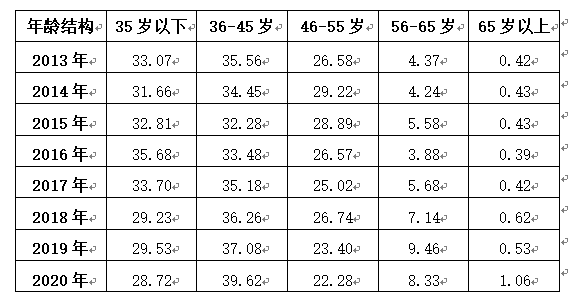 表1:2013-2020年科技成果完成人员年龄结构(%)