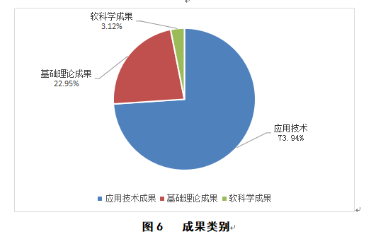 在2020年度登记的353项科技成果中,应用技术成果261项,占登记成果总数的73.94%;基础理论成果81项,占登记成果总数的22.95%;软科学成果11项,占登记成果总数的3.12%。应用技术类成果数量远远超过另外两类成果。见图6: