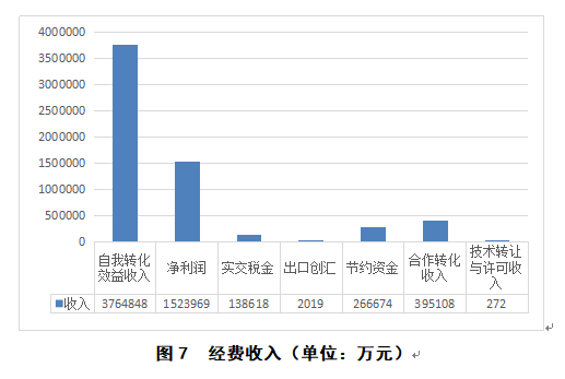 (1)2020年353项科技成果自我转化效益合计收入3764848万元。其中,净利润1523969万元,占收入总额的40.48%;实交税金138618万元,占收入总额的3.68%;出口创汇2019万元,占收入总额的0.05%;节约资金266674万元,占收入总额的7.08%;合作转化收入395108万元,占收入总额的10.49%;技术转让与许可收入272万元,占收入总额0.01%。如图7:
