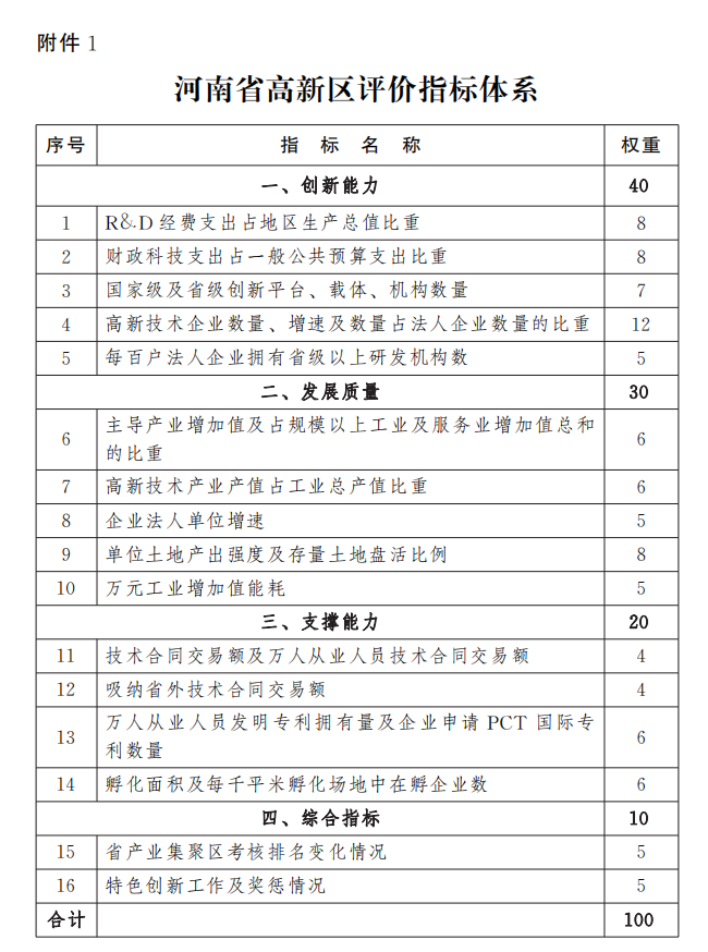 第十条 评价指标体系包括创新能力、发展质量、支撑能力、综合指标4个一级指标、16个二级指标,评价指标总权数100,对应总分数100分。