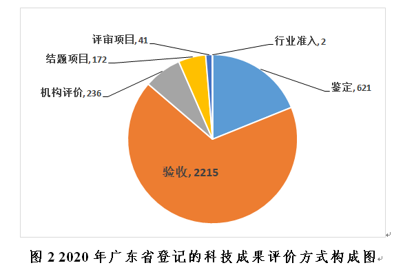 2020年登记的科技成果中,评价方式为项目验收的有2215项,占2020年成果登记总数的67.08%,较2019年增加了437项,增长率达24.58%;评价方式为鉴定和机构评价的有621项和236项,占2020年登记成果总数的18.81%和7.15%,评价方式为评审、行业准入、评估、结题、知识产权的分别为41项、2项、15项、172项和0项。2020年登记成果的评价方式呈现以验收方式为主、鉴定方式为辅的特点(见图2)。