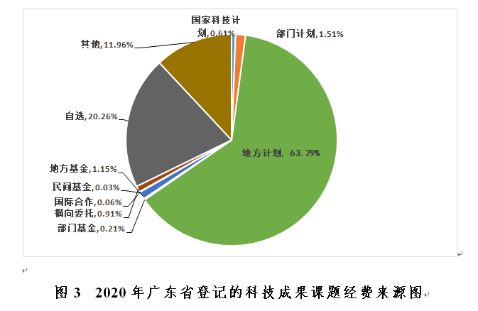 2020年,广东省登记成果的课题来源以地方计划为主,有2090项,占2020年成果登记总数的63.29%;其他来源按数量排序依次为:自选669项、其他计划395项、部门计划50项,地方基金38项,横向委托30项,部门基金7项,国际合作2项,民间基金1项(见图3)。