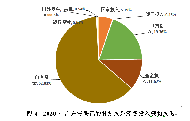 2020年广东省登记的科技成果投经费总额达1724.96亿元,以自有资金投入为主,达1083.71亿元,占2020年经费来源投入总额的62.83%;其次,地方投入333.91亿元,基金投入200.47亿元,国家投入89.45亿元,其他投入9.39亿元,银行贷款5.4亿元,部门投入2.61亿元,国外资金投入0.005亿元(见图4)。