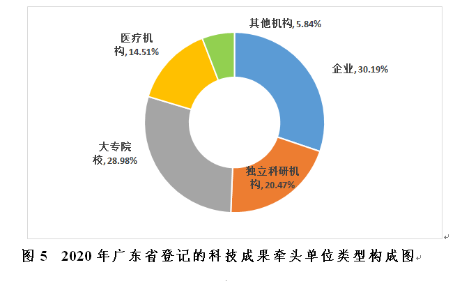2020年广东省登记的科技成果中,按各牵头单位类型完成项目数排序,依次为:企业997项、独立科研机构676项、大专院校957项、医疗机构479项、其他机构193项。牵头单位为企业的登记成果数占总数的30.19%,是本年度广东省科技成果的主要登记单位类型(见图5)。