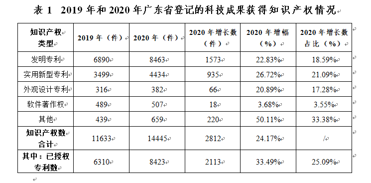 6.知识产权获取数量显著增长。2020年,广东省登记的科技成果共获得知识产权14445件,同比增长24.17%,其中获得发明专利8463件,同比增长22.83%。
