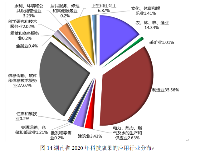 表14 湖南省2020年科技成果的应用行业分布数及占比