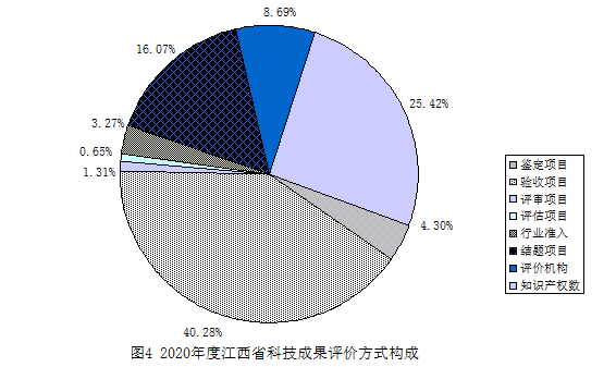 2020年度江西省登记的成果评价方式以验收为主,机构评价、结题为辅,鉴定及其他评价方式并存。登记成果中验收项目431项,占登记成果总数的40.28%,;机构评价项目93项,占8.69%,结题项目172项,占16.07%;知识产权授权项目272项,占25.42%;鉴定、评审、评估、行业准入等其他评价方式项目102项,占9.53%(见图4)。