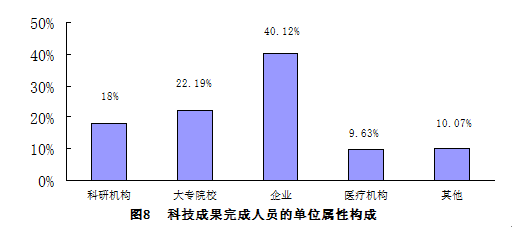 2020年度登记的科技成果涉及到的完成人员共7396人次。以单位属性看,企业和大专院校的科技人员最多。其中,企业科技人员2967人次,占40.12%;大专院校人员1641人,占22.19%;医疗机构712人,占9.63%;科研机构科技人员1331人,占18%;其他745人,占10.07%(见图8)。