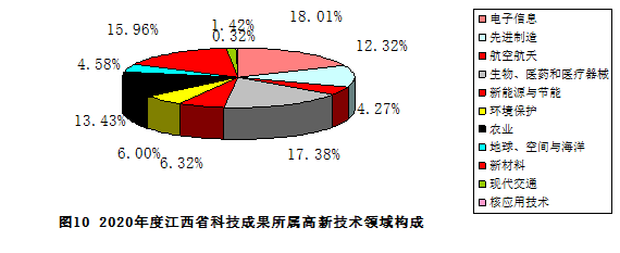 2020年度江西省登记的843项应用技术成果中,有633项属高新技术领域,占登记的科技成果总数的59.16%。其中,电子信息114项,占所登记的高新技术领域成果总量的18.01%;先进制造78项,占12.32%;航空航天27项,占4.27%;现代交通9项,占1.42%;生物医药和医疗器械110项,占17.38%;新材料101项,占15.96%;新能源与节能40项,占6.32%;环境保护38项,占6.0%;地球、空间与海洋29项,占4.58%;核应用技术2项,占0.32%;现代农业85项,占13.43%。电子信息领域在全省高新技术领域中所占比例最高,其次生物医药、新材料和农业也都占有较大比例( 见图10)。