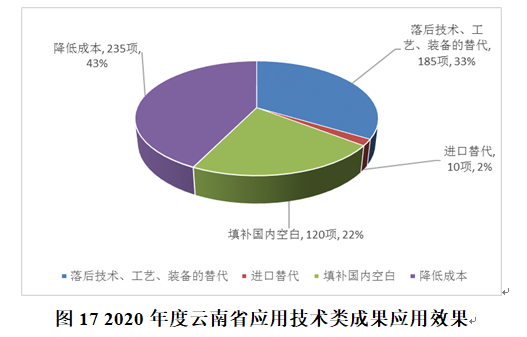 在2020年度所登记的应用技术成果中,550项成果应用后已产生实际效果,其中:落后技术、工艺、装备的替代有185项,占33.64%;实现进口替代的有10项,占1.82%;填补国内空白的有120项,占21.82%;实现降低成本的有235项,占42.73%。