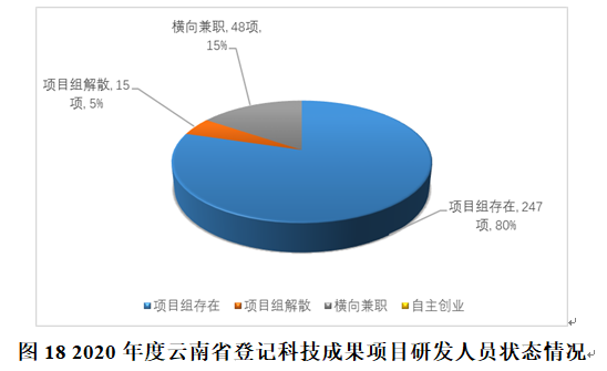 在2020年度所登记的应用技术成果转化过程中,有310项成果填报了项目组在该成果进行登记时的状态情况,其中:项目组基本完整保持的为247项,占79.68%;项目组解散的为15项,占4.84%;横向兼职的为48项,占15.48%;自主创业的为0项。