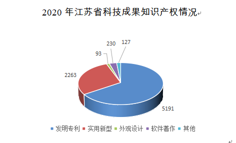 2020年江苏省科技成果登记的项目中,共拥有知识产权7904件,其中发明专利为5191件,实用新型专利为2263件,外观设计专利为93件,软件著作权数为230件,其他127件。已授权专利数为6741件,制定标准数共计22项,其中国家标准2项,行业标准11项,地方标准2项,企业标准7项。
