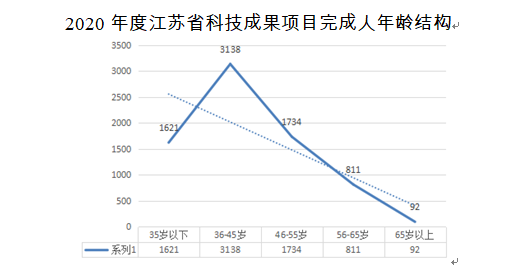 2020年江苏科技成果完成人的年龄结构依旧以55岁以下为主,其中36-45周岁的成为完成人的主力军:35岁以下(含35岁)1621人次,占总数的22%;36-45岁3138人次,占总数的42%;46-55岁1734人次,占总数的23%;56-65岁811人次,占总数的11%;65岁以上的92人次。