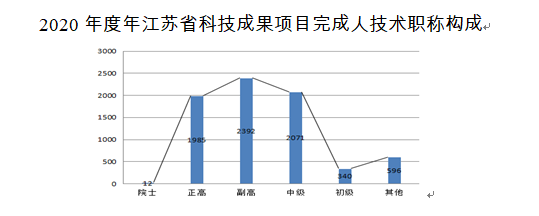 2020年江苏科技成果完成人的技术职称构成以中高级以上为主:院士12人;正高1985人,副高2392人,中级2071人,初级340人,其他596人次。2020年度江苏科技城成果完成人的技术职称构成与上一年度保持平衡。