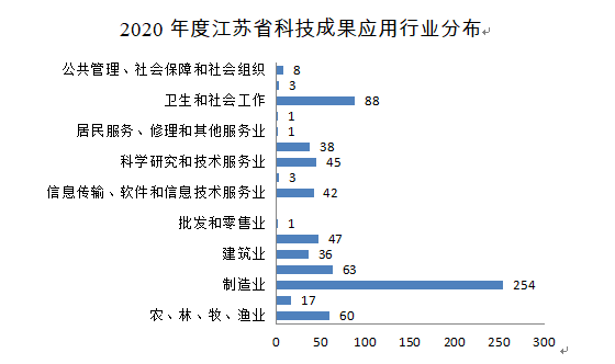 2020年江苏科技成果应用行业涉及17个方面,农、林、牧、渔业60项,采矿业17项,制造业254项,电力、热力、燃气及水的生产和供应业63项,建筑业36项,批发与零售业1项,交通运输、仓储和邮政业47项,信息传输、软件和信息技术服务业42项,金融业3项,房地产业1项,科学研究和技术服务业45项,水利、环境和公共设施管理业38项,居民服务、修理和其他服务业1项,教育1项,卫生和社会工作88项,文化、体育和娱乐业3项,公共管理、社会保障和社会组织8项。