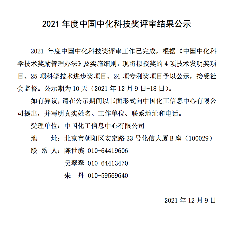 2021年度中国中化科技奖评审结果公示