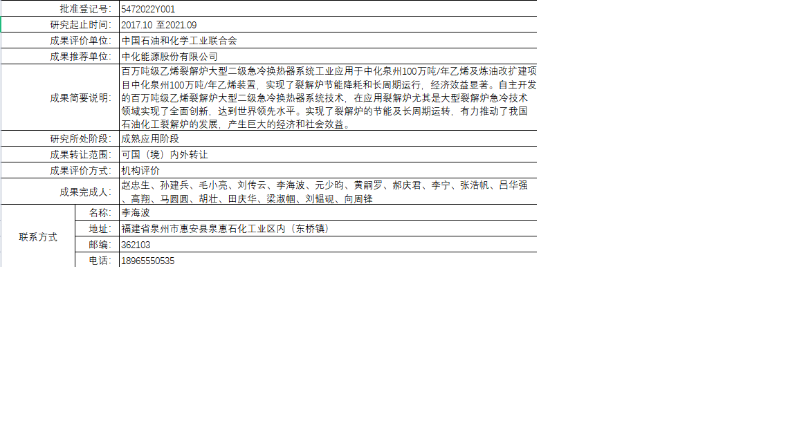 中化泉州百万吨级乙烯裂解炉大型二级急冷换热器系统技术开发研究和工程应用