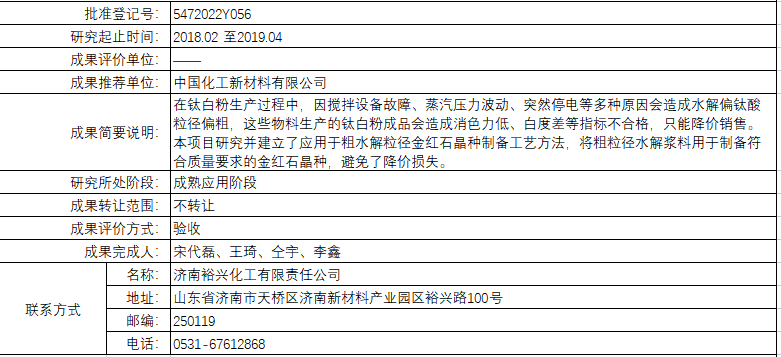 根据中国中化控股有限责任公司科技成果登记管理办法,按照科技成果管理程序,现将中国中化控股有限责任公司登记的成果予以公告。对公告上登记的科技成果内容持有异议者,可与中国中化控股有限责任公司科技成果登记中心联系。其管理有效期(自公告之日起)为期7天。