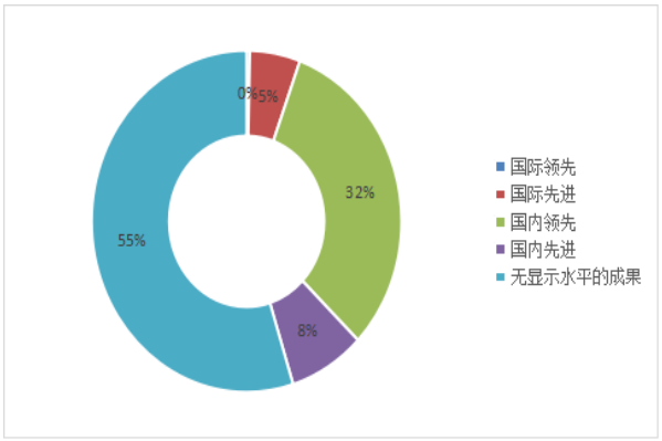 根据登记成果数据分析,达到国际领先水平成果8项,占总数的0.33%;国际先进水平成果127项,占总数的5.22%;国内领先水平成果764项,占总数的31.41%;国内先进水平成果191项,占总数的7.85%,无显示水平的成果1342项,占总数的55.19%(见图2)。