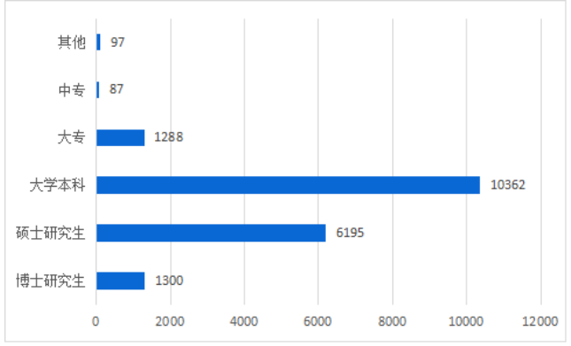 博士研究生1300人次,硕士研究生6195人次,大学本科10362人次,大专1288人次,中专87人次,其他97人次(见图5)。2022年全省登记成果涉及到的完成人员中,硕士研究生学历以上的完成人占总完成人数的38.78%。