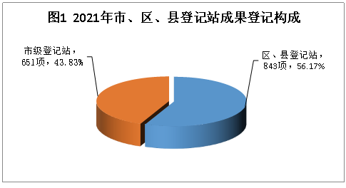 2021年,重庆市科技成果登记数量1485项。其中,市级登记站登记成果651项,约占全市成果登记总数的43.83%;各区县成果登记站登记成果843项,占全市成果登记总数的56.17%。(见图1)