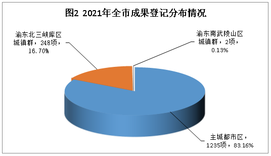 主城都市区登记成果共1235项,约占全市成果登记数量的83.16%;渝东北三峡库区城镇群登记成果共248项,约占全市成果登记数量的16.70%;渝东南武陵山区城镇群登记成果共2项,约占全市成果登记数量的0.13%。(见图2)