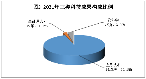 总的看,全市登记的科技成果以应用技术为主,共登记应用类成果1413项,与去年项数相比增加了97项,同比增长约7.37%,占全年登记成果总数的95.15%;登记软科学成果45项,与去年项数相比增加24项,同比增长114.29%,占全年登记成果总数的3.03%;登记基础理论成果27项,占全年登记成果总数的1.82%。(见图3)