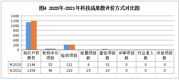 科技成果评价方式以知识产权授权、验收为主,机构评价、鉴定和结题并存。从评价方式看,知识产权授权1204项,与去年同比增加58项;验收项目数210项,与去年同比减少1项;机构评价成果46项,与去年同比减少6项;结题成果15项,与去年同比增加9项;鉴定成果10项,与去年同比减少21项;未见评审、行业准入和评估项备案登记。(见图4)