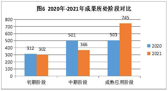 初期阶段成果302项,占21.37%(2020年初期阶段成果312项,占23.71%);中期阶段成果366项,占25.90%(2020年中期阶段成果501项,占38.07%);成熟应用阶段745项,占52.73%(2020年成熟应用阶段503项,占38.22%)。与2020年成果的成熟应用相比增加242项。(见图6)