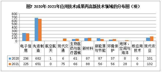 属高新技术领域成果数为1377项,占应用技术成果数的97.45%。排名前三的分别是:先进制造651项,占46.07%;电子信息225项,占15.92%;现代农业132项,占9.34%。其他排名依次为:新材料88项;现代交通75项;生物医药与医疗器械66项;新能源与节能56项;环境保护56项;地球、空间与海洋28项;今年无航空航天和核应用技术成果登记。从现有成果统计数据分析,先进制造、电子信息、现代农业、新材料、现代交通、生物医药和医疗器械、新能源与节能等技术领域是我市重点发展的高新技术支柱产业。(见图7)