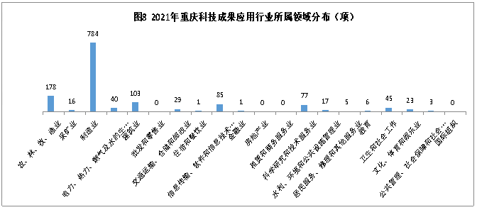 根据成果应用行业分类,制造业最高,为784项,所占比例为55.48%;其次是农、林、牧、渔业成果数为178项,所占比例为12.38%;建筑业103项,所占比例为7.29%;其他排序依次是: 信息传输、软件和信息技术服务业85项;科学研究和技术服务业77项;卫生和社会工作45项;电力、燃气及水的生产和供应业40项;交通运输、仓储和邮政业29项;文化、体育和娱乐业23项;水利、环境和公共设施管理业17项;采矿业16项;教育6项;居民服务、修理和其他服务业5项;公共管理、社会保障和社会组织3项;住宿和餐饮业与金融业各1项;所占比例24.85%。批发和零售业、房地产业、租赁和商务服务业与国际组织无成果登记。(见图8)