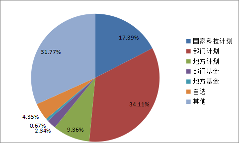 登记的299项科技成果中,国家科技计划52项,占全年总数17.39%;部门计划102项,占全年总数34.11%。地方计划28项,占全年总数9.36%;部门基金7项,占全年总数2.34%,地方基金2项,占全年总数0.67%。自选13项,占全年总数4.35%;其他95项,占全年总数31.77%;因此,部门计划是科技成果的主要来源。