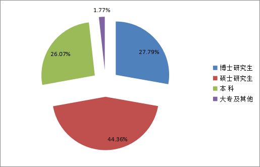在完成项目人员文化程度方面,博士研究生1035人次,占全部人员27.79%;硕士研究生1652人次,占全部人员44.36%;本科生971人次,占全部人员26.07%;大专生及以下66人次,占全部人员的1.77%。从学历比例上看,博士、硕士和本科人员是科研的中坚力量。