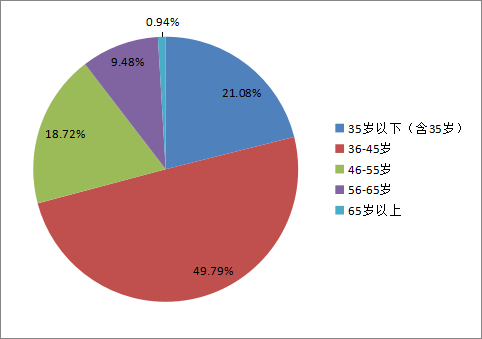 在年龄结构方面,35岁以下(含35岁)人员总计785人次,占人员总数的21.08%;36-45岁人员总计1854人次,占人员总数49.79%;46-55岁总计697人次,占人员总数18.72%;56-65岁总计353人次,占人员总数9.48%;65岁以上人员总计35人次,占人员总数0.94%。从年龄结构上看,36-45岁人员,是科研的中坚力量。